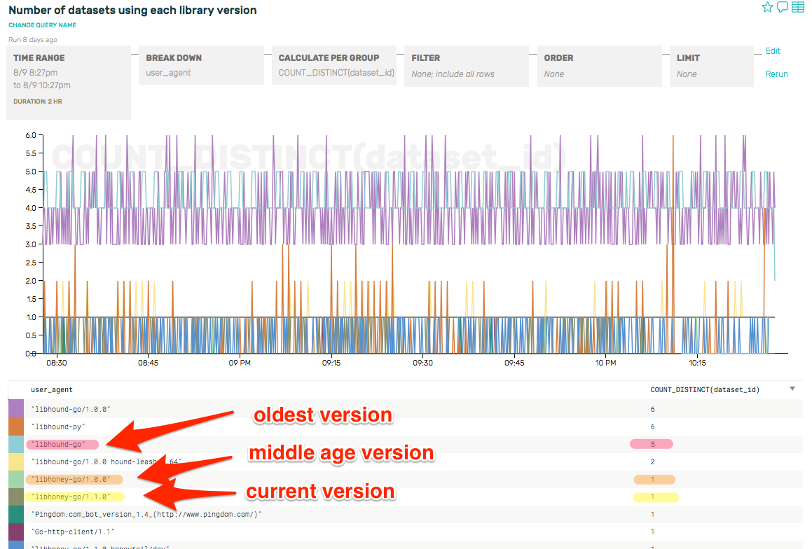 Let’s find out how many datasets are representing each version of our client library, by setting up a query to track unique User-Agents and seeing how many datasets were associated with the distinct User-Agent values: