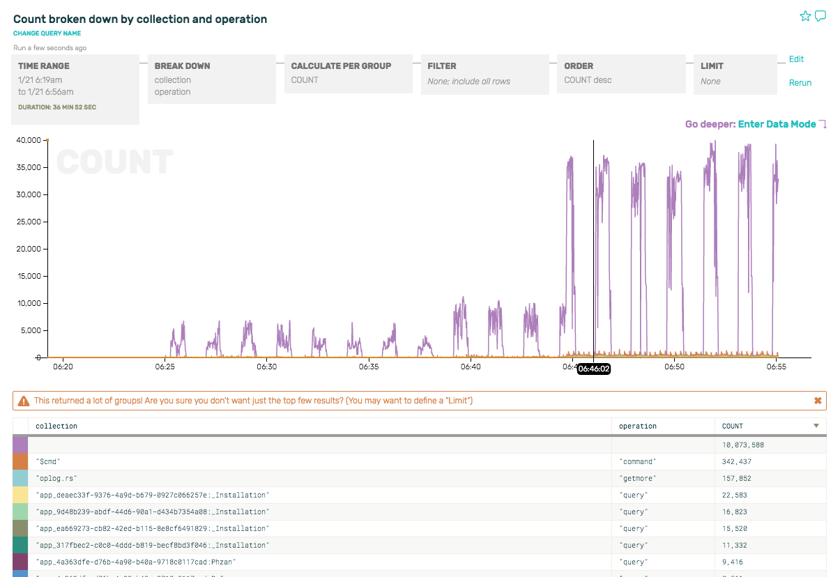 Let’s add database to the breakdown, in order to find out all the database names, and query count/sec/database. And we’ll do the same with collection to see which collections are hottest.