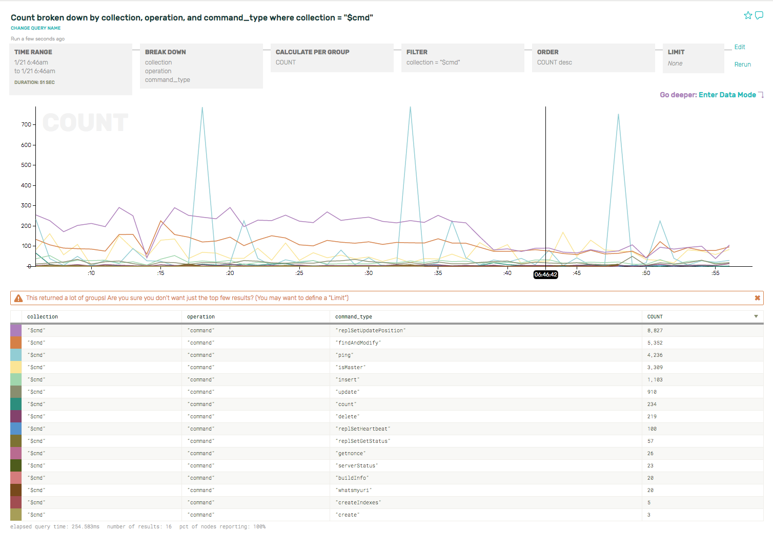 If you’re curious about the mongo internal commands and what they’re doing, for example, break down by command type and see what’s happening under the hood on just the $cmd collection.
