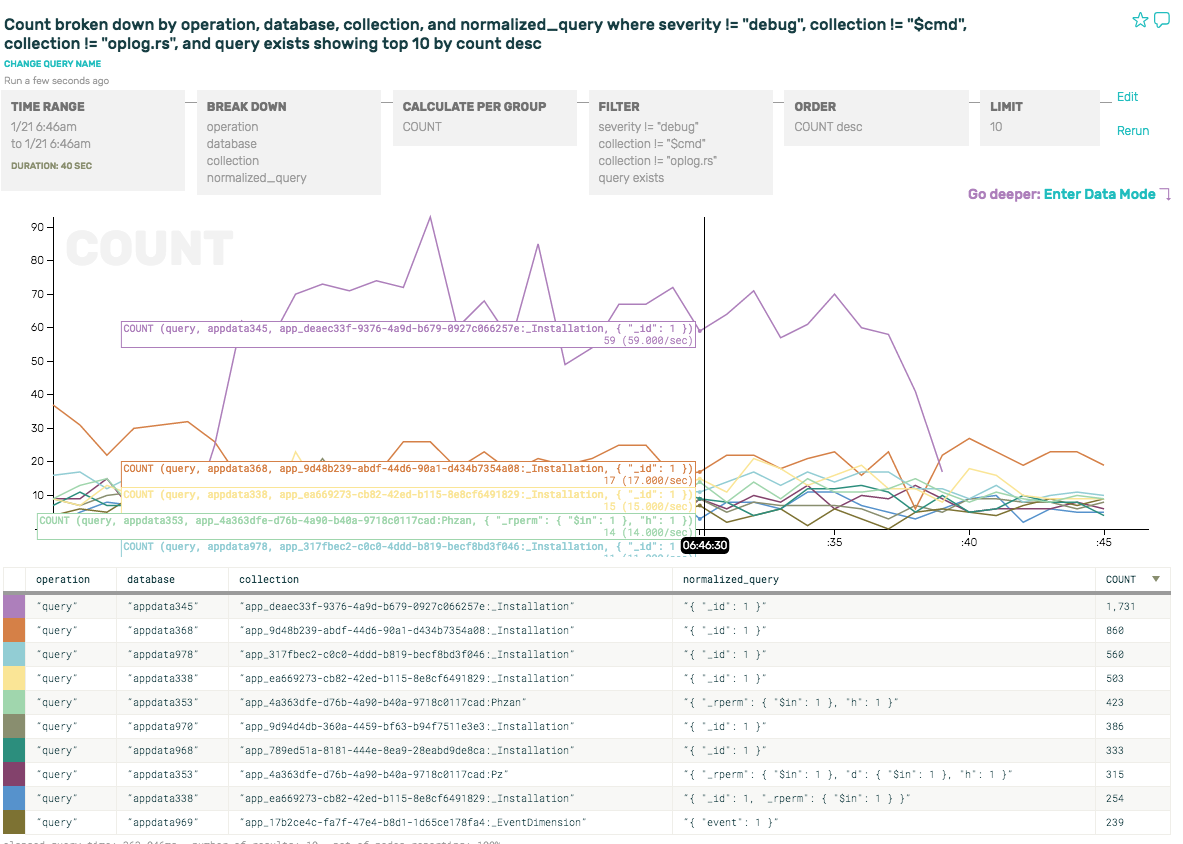 But its most common normalized_query is pretty boring: { "_id": 1 }. Let’s take a look at the appdata353 instead, the 8th row down. Its normalized_query looks a little more interesting. We add a filter to drill down to just that database (database = “appdata353”) and—finally—dig into some actual interesting queries by entering Data Mode.