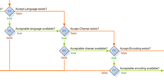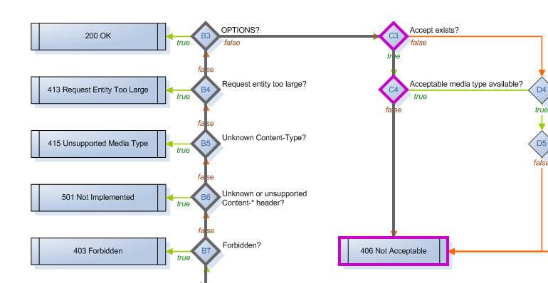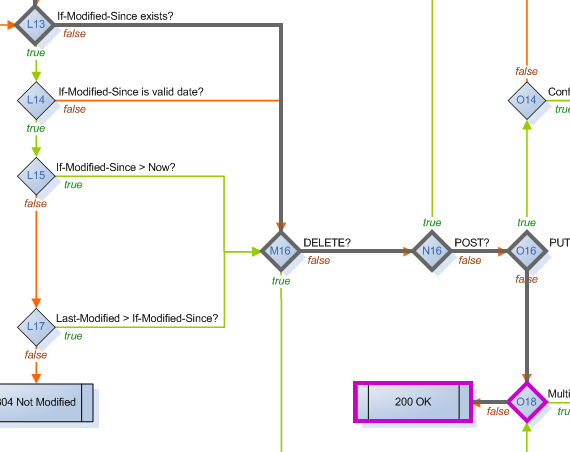 It’s easy to see that the request made it all the way to the 200 OK result at grid location N18. Along the way, it passed through many decisions where the default behavior was chosen (grey-outlined diamonds), and a few where the resource’s own implementation was called (purple-outlined diamonds). Clicking on any decision will display more information about what happened there.