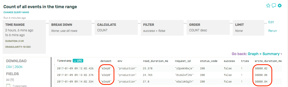 In this example, glancing at the raw rows makes it obvious that the trouble is with shard 8 and the write duration of 30s is suspiciously similar to our default timeout for writes. Further investigation is jumped forward several steps from just “the end to end check is failing” to “look at the write path for shard 8”—this kind of extra detail drops the time to resolution for our outage by an order of magnitude.
