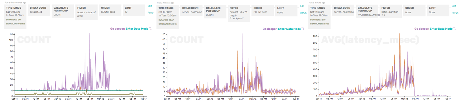 This is enough to tell us that the problem isn’t in our API server writing to Kafka (the e2e check’s write duration would reflect that) or our storage server writing to disk (the cum_write_time would reflect that), but instead in between—and we should take a hard look at the moving parts related to partition 5 in Kafka.