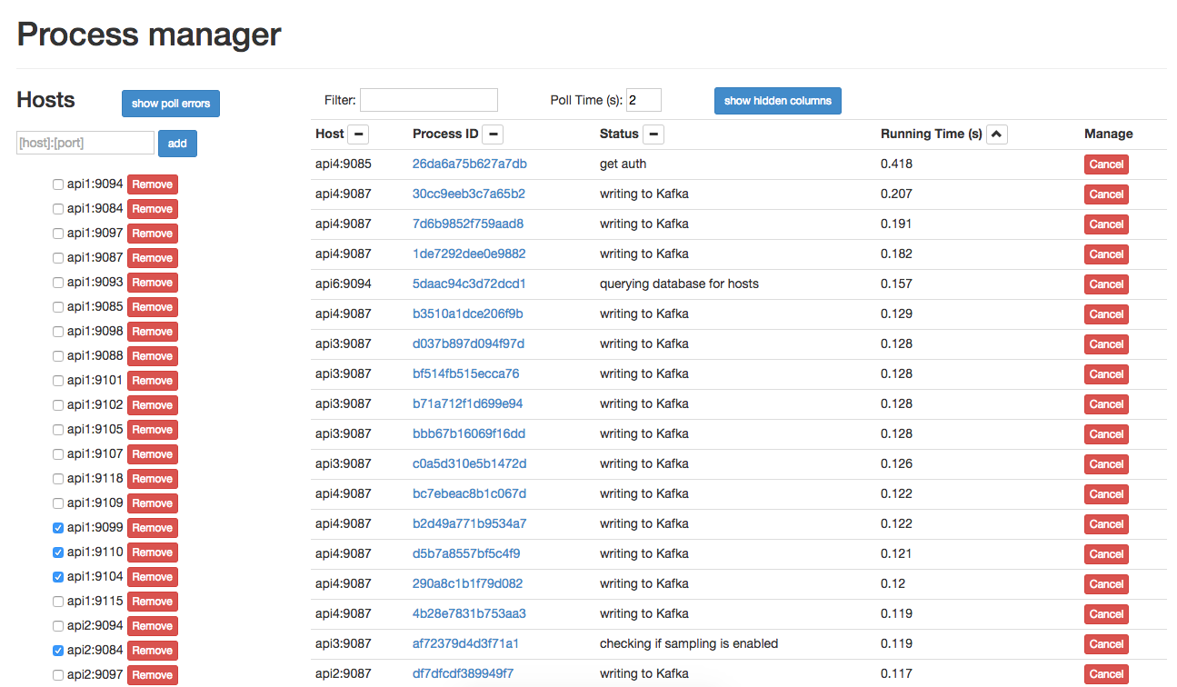 and the status would be set accordingly until the next pm.Status update. Then, whenever we need to see what’s running on a service, we simply use pm’s REST API to get a snapshot of the process list. We have a web UI and a CLI to use with the REST endpoints.