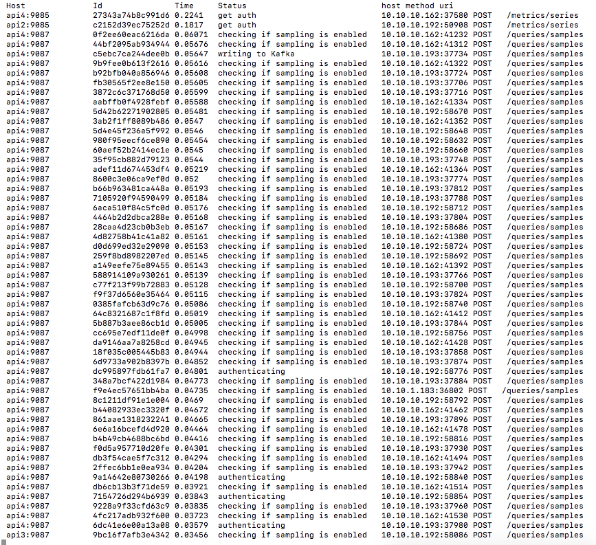 What about stuff in progress? How do you find out what’s happening right now, like you can with top? At VividCortex, we wanted something like that for our web services, so we developed pm. pm is a Go package that lets you integrate process management into an application. In a nutshell, pm allows users to create a process list with an entry for each running request, and have a dynamically-updated status for each of those requests. It’s been really useful when tracking down long-running requests that cause problems.