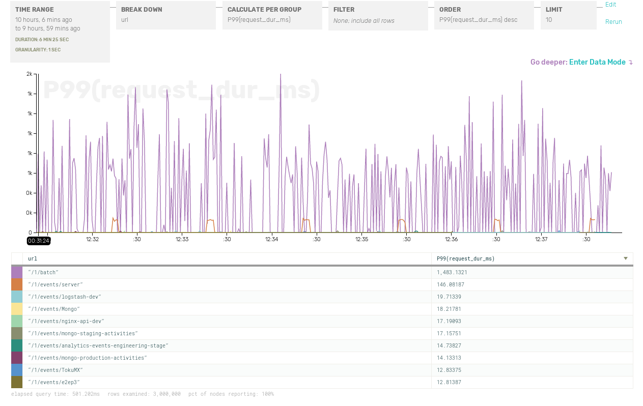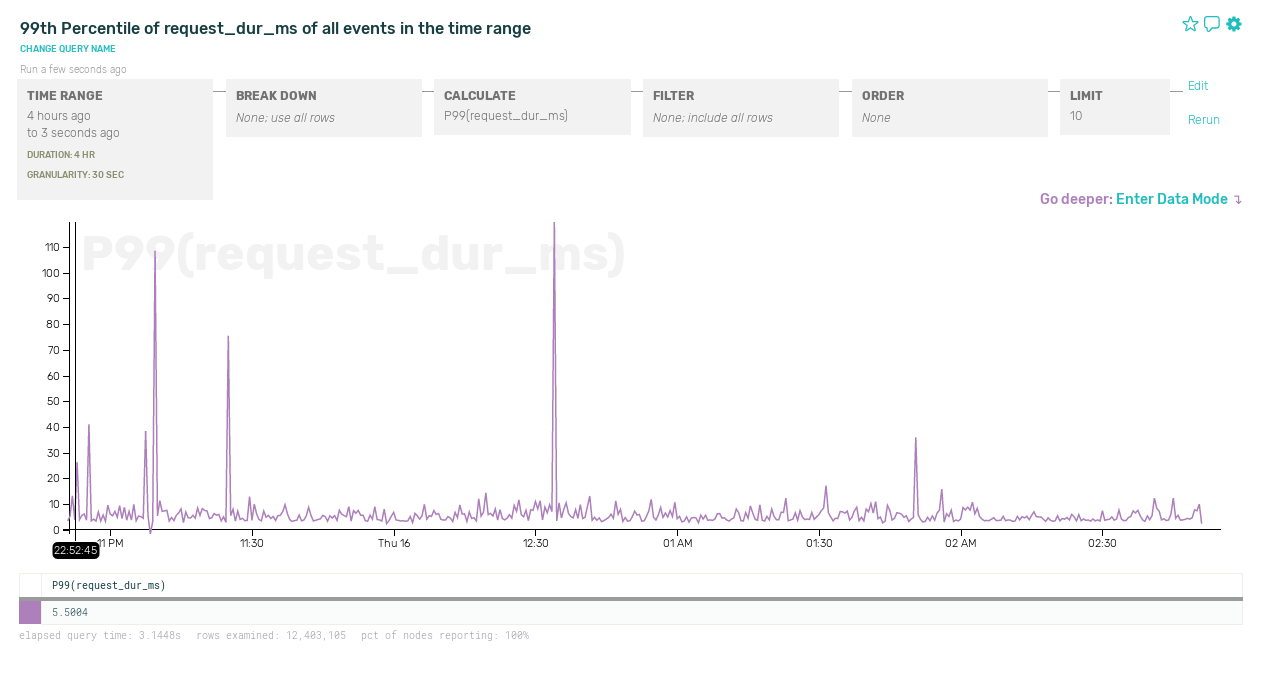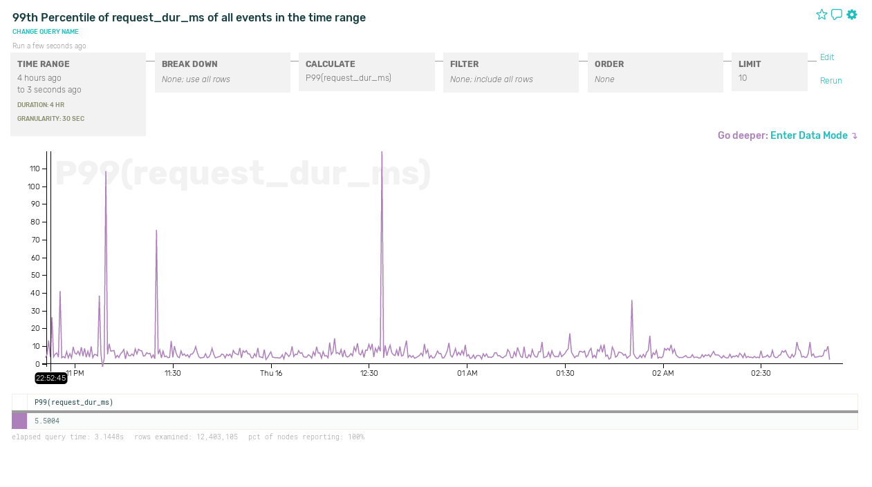 Within Honeycomb, every event has an associated sample rate and all the calculations we do to visualize your data correctly handle these variable sample rates. This feature lets us start to do some really interesting things with sampling within our own systems: reducing our overall volume while still retaining different levels of fidelity depending on the type of traffic.