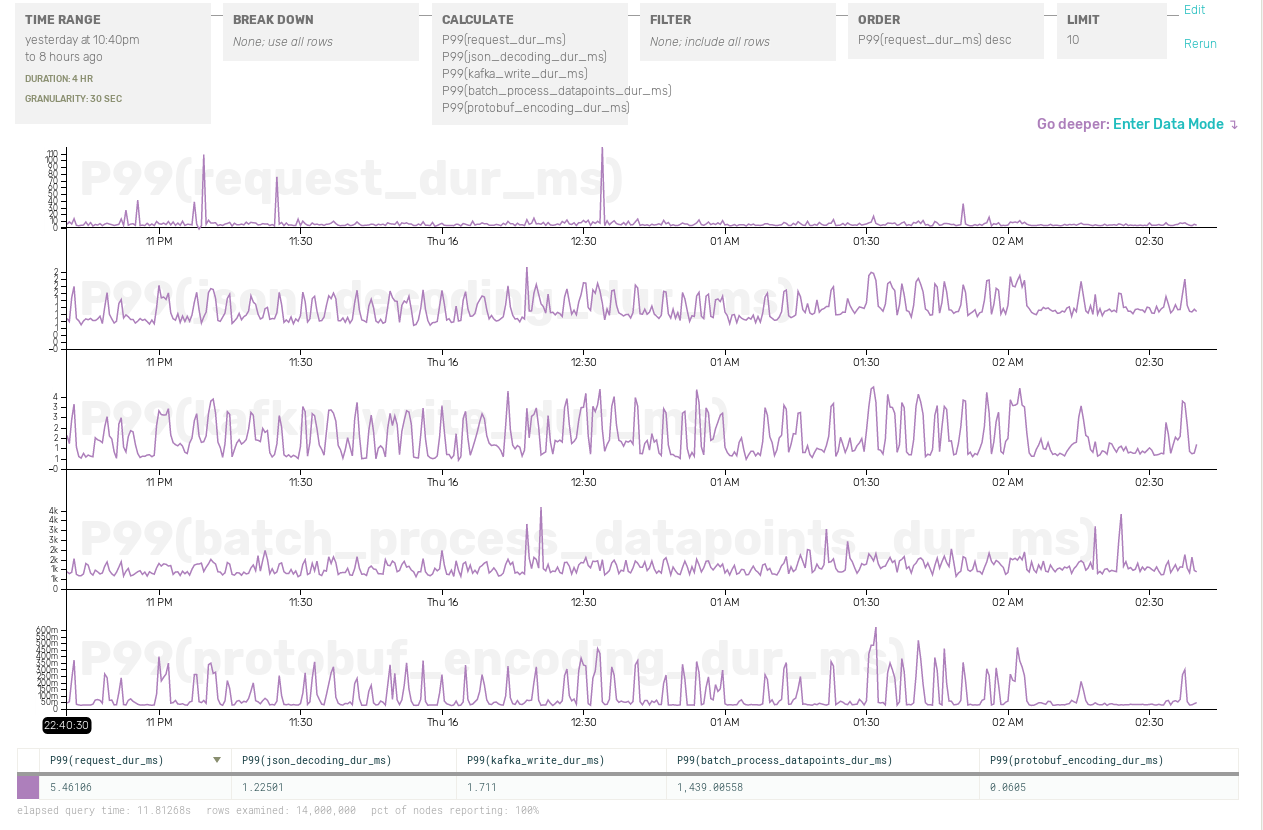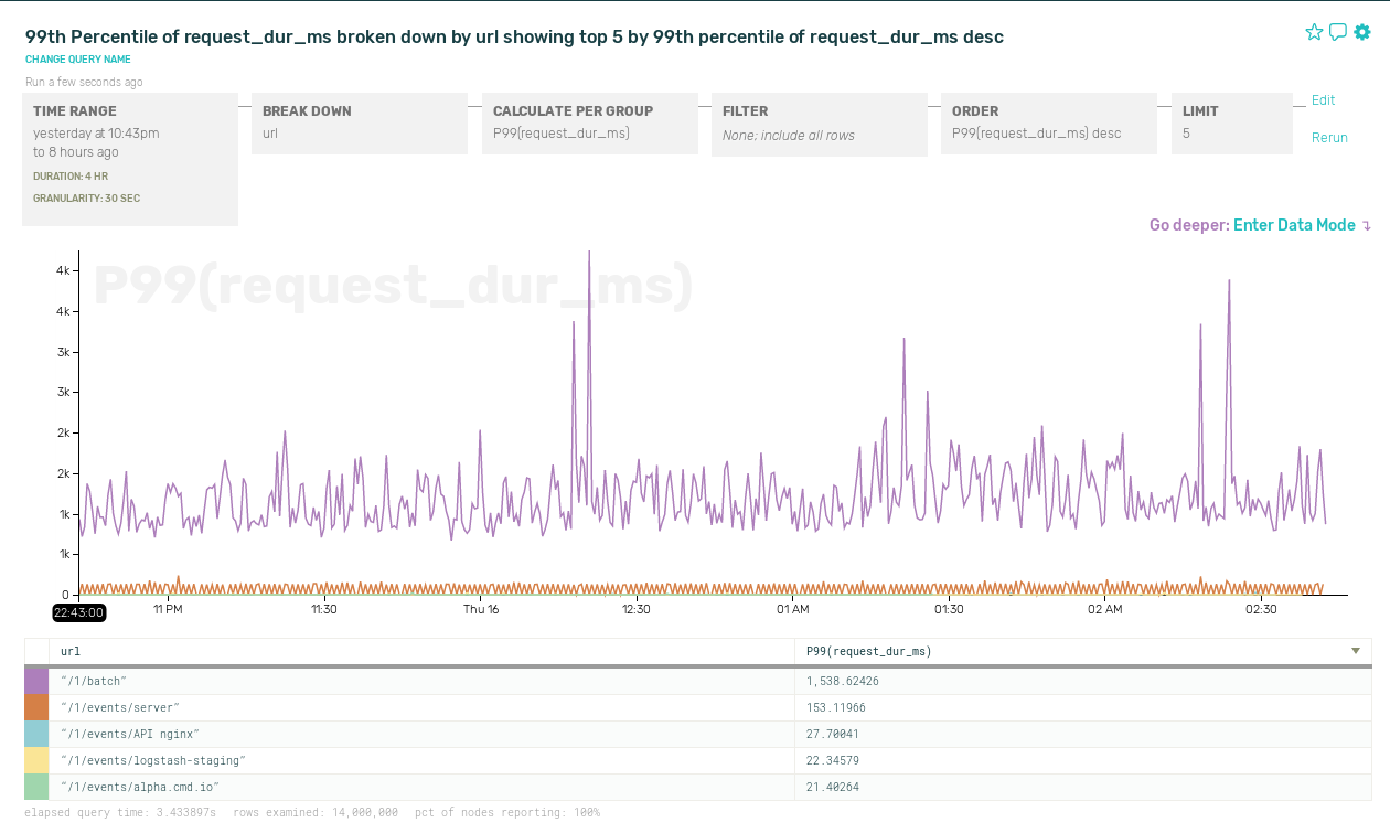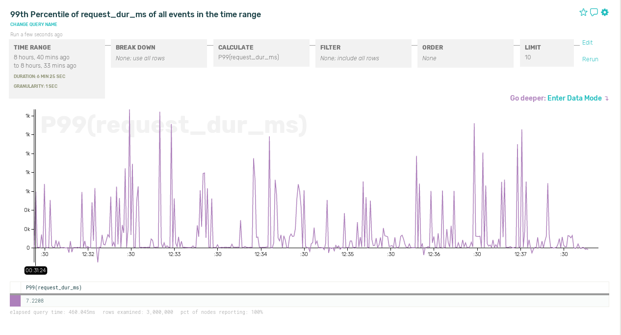 By choosing the sample rate based on an aspect of the data that we care about, we’re able to gain more flexible control over both the total volume of data we send to our analytics system and the resolution we get looking into interesting times in our service history.